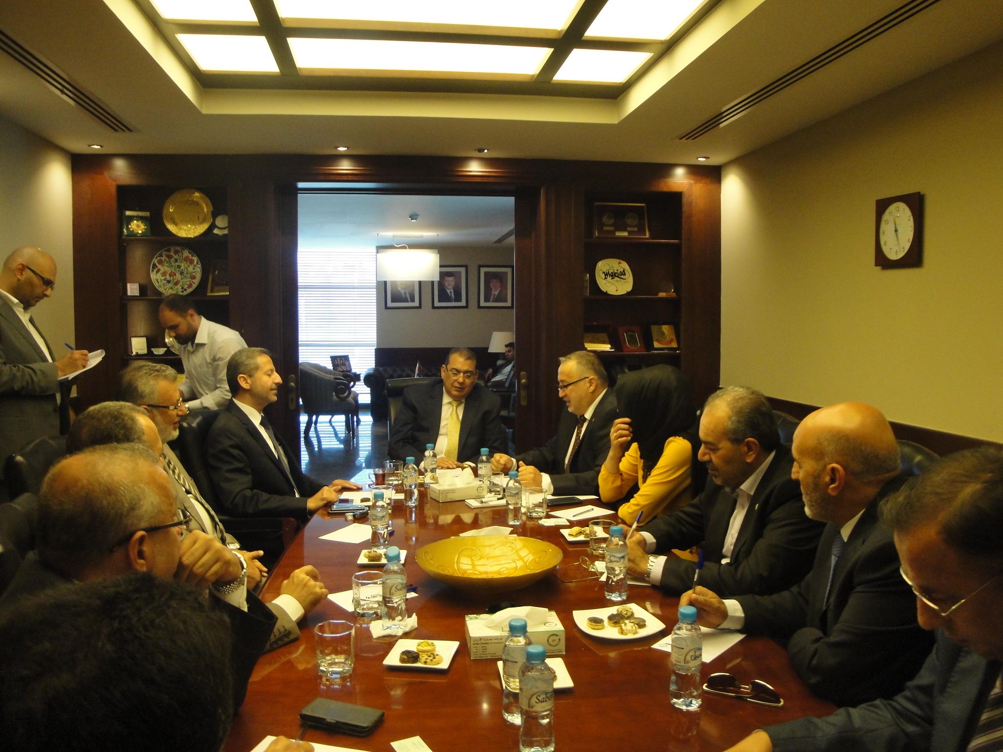 التقى سعادة السيد نائل الكباريتي رئيس مجلس ادارة غرفة تجارة الاردن بمقر الغرفة بسعادة السيد غزوان مصري ممثل رئاسة جمعية رجال الاعمال والصناعيين المستقلين في تركيا والوفد المرافق له بحضور السيدة نيل جوكشه المستشار التجاري لدى السفارة التركية في عمان والسيد خالد حبنكة عضو مجلس ادارة غرفة تجارة الأردن.