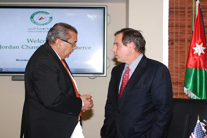 التقى السيد نائل الكباريتي رئيس غرفة تجارة الأردن يوم أمس الاثنين الموافق 9/9/2013 السيد ستيوارت جونز السفير الأمريكي بحضور رؤساء الغرف التجارية الأردنية وعدد من أعضاء مجلس إدارة الغرفة والملحقين التجاري والاقتصادي في السفارة ، وذلك في مقر الغرفة حيث تم خلال اللقاء التباحث في سبل تطوير العلاقات الاقتصادية وزيادة حجم التعاون الاقتصادي والشراكة بين البلدين، بالإضافة الى امكانية زيادة المساعدات المقدمة من الجانب الامريكي لدعم مشاريع القطاع الخاص عبر برامج الوكالة الامريكية للتنمية الدولية.
